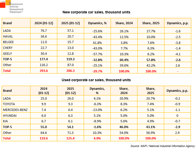 According to the marketing agency NAPI, 331.7 thousand cars were sold to corporate clients in January-December 2025. Of these, 206.3 thousand units were new and 125.4 thousand units were used.