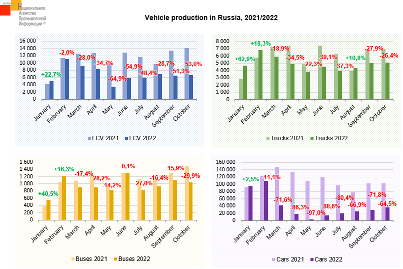 According to the data of NAPI (National Industrial Information Agency), 392.1 thousand cars (-64.5% on the same period of the last year), 49 thousand trucks (-18.0%), 68.9 thousand light commercial vehicles ( - 38.7%) and 9.6 thousand buses (- 13.5%) were produced over ten months of the current year. It should be noted that since June, the car production has been growing month-by-month.