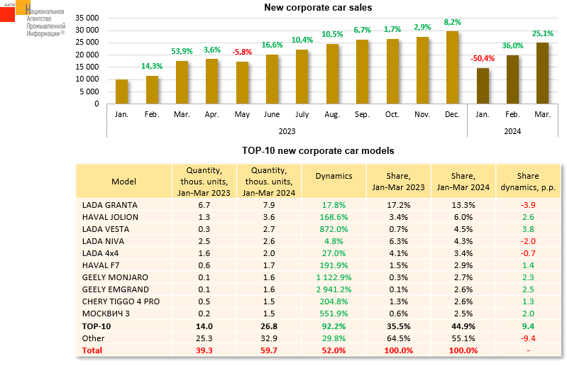 According to the marketing agency NAPI, in Q I 2024, new car sales to corporate clients increased by 52%. LADA GRANTA became the most popular corporate car, although its share decreased by 3.9 percentage points (p.p.) on Q I of last year. As of the new Russian cars, MOSKVICH 3 entered TOP-10, having accounted for 2.5% of all corporate sales.