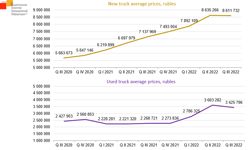 According to the NAPI (National Industrial Information Agency), in Q III 2022, the average prices for new and used trucks were adjusted. Average prices for new trucks decreased by 0.3% on Q II 2022 and amounted to 8.6 million rubles. Average prices for used trucks fell by 4.9% on Q II and reached 3.4 million rubles.