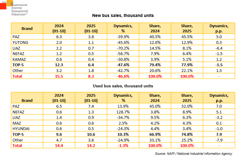 PAZ, YUTONG, and KAMAZ sales decreased slightly less, while their shares grew to 45.5%, 12.9%, and 5.1%, respectively.