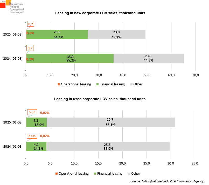 At the same time, 25.5 thousand new LCV were issued to corporate clients through operational and financial leasing over the first eight months of the current year, representing a 29.4% decrease on the similar period of 2024, when 36.1 thousand new vehicles were sold. Also, 4.3 thousand used LCV were leased, which was a 2.4% rise on last year's figure, when 4.2 thousand units were sold.