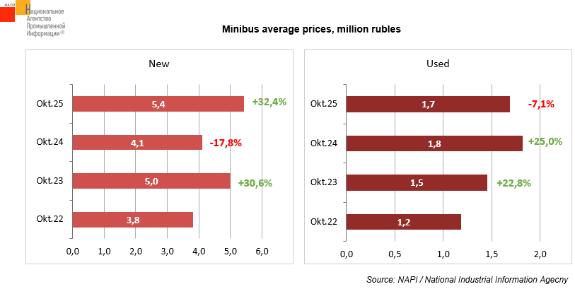 The marketing agency NAPI analyzed the dynamics of average prices for new and used* minibuses**. In October 2023, the cost of a new minibus increased by 30.6%, while that of a used one - by 22.8%. In October 2024, the average price for a new minibus fell by 17.8%, while that for a used one grew by 25%. In October of the current year, new minibuses appreciated significantly, reaching 5.4 million rubles (+32.4%). At the same time, the average price for used vehicles decreased slightly, reaching 1.7 million rubles (-7.1%). Over three years, from October 2022 to October 2025, new minibuses appreciated by 1.6 million rubles on average, while used minibuses - by 500 thousand rubles.