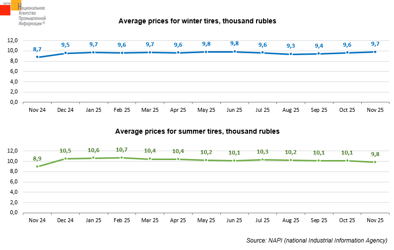 Over the year, from November 2024 to November 2025, the average price for non-premium winter tires increased by 11.6%, while that for summer ones - by 9.3%. Over the month, from October to November of the current year, the cost of winter tires grew by 1.3% to 9.7 thousand rubles, while that of summer ones decreased by 3.3% to 9.8 thousand rubles.