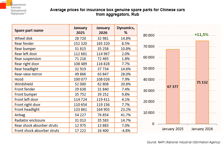Over the year, from January 2025 to January 2026, the average price for genuine spare parts increased by 11.5%. The largest increase was shown by airbags (+41.7%). Prices for rear-view mirrors, front headlights, and windshields grew by more than 20%, while those for wheel disks, radiator enclosures, and rear headlights - by almost 15%.