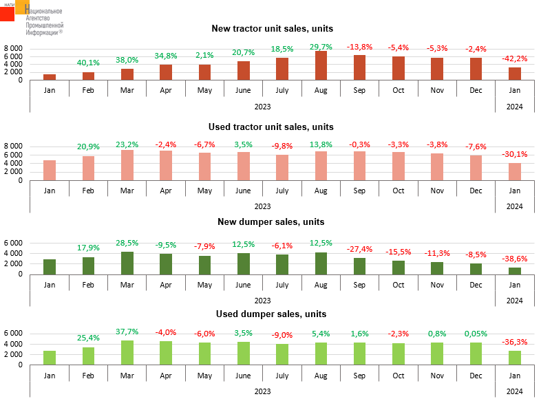 According to the marketing agency NAPI, in January 2024, sales of new tractor units increased by 115.4% on January last year. The record month was August 2023, when 7.5 thousand tractor units were sold; from September to January, sales of new tractor units decreased on the previous month. In January 2024, new dumper sales fell by 54.1% on January last year. The record month was March 2023, when 4.3 thousand new dumpers were sold. Since September 2023, sales of new dumpers have also declined month-on-month. In general, in January 2024, the new truck market grew by 10.3% on January 2023.