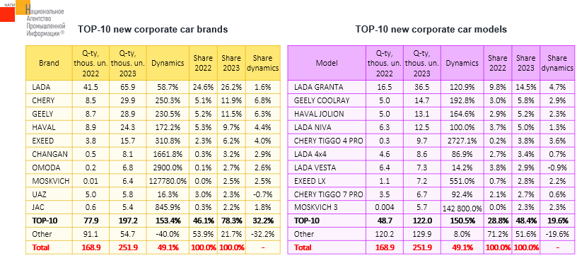 Following results of 2023, the most popular car among corporate clients was LADA GRANTA, GEELY COOLRAY took the second place.