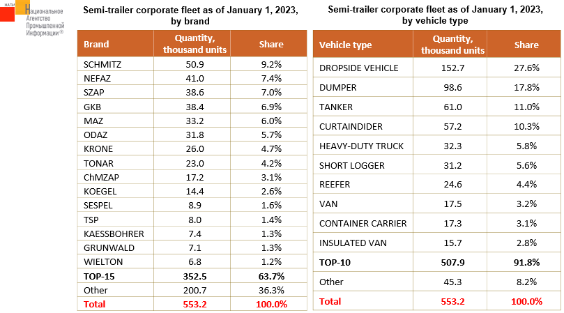 According to the marketing agency NAPI, as of January 1, 2023, the trailer-semi-trailer corporate fleet numbers 553.2 thousand units. The most popular trailer brand among corporate clients is SCHMITZ, it accounts for slightly more than 9% of the corporate fleet.