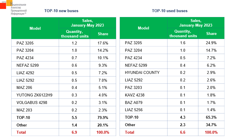 According to the marketing agency NAPI, new bus sales increased by 28.8% over 5 months of the current year. In January-May last year, 5.4 thousand new buses were sold. The used bus market grew by 23.2%, while over the similar period of the last year, used bus sales amounted to 5.3 thousand units. It is interesting to note that TOP-3 is similar in the new and used bus markets.