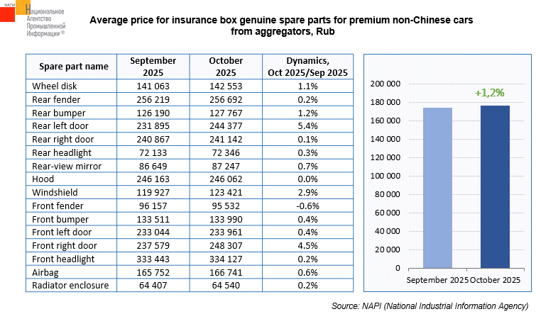 The marketing agency NAPI analyzed insurance box genuine spare parts’ prices for premium non-Chinese cars from aggregators. Over the month, from September 2025 to October 2025, the average price for genuine spare parts increased by 1.2%. The most significant price increase concerned rear left door (5.4%), front right door (4.5%), and windshield (2.9%). The price for the front fender decreased slightly (-0.6%). The average price for the hood remained stable.