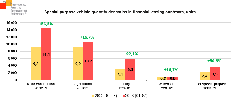According to the marketing agency NAPI, over 7 months of the current year 35.5 thousand special purpose vehicles were issued for financial leasing. Compared to the similar period last year, when 24.6 thousand units were leased, the growth made 69.3%. The leasing composition changed slightly over the year. Thus, the share of road construction vehicles increased to 40.5%, while that of lifting vehicles - to 16.8%. The share of agricultural vehicles decreased to 30.1% due to low growth rates.