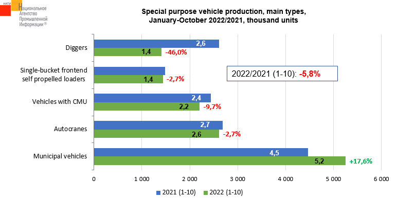 According to the data of NAPI (National Industrial Information Agency), 57.7 thousand special purpose vehicles were produced over ten months of 2022 against 61.3 thousand special purpose vehicles produced over ten months of the last year. Only the production of municipal vehicles increased (+17.6%) among the main types of special purpose vehicles presented on the graph.