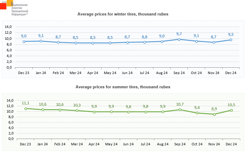 The marketing agency NAPI analyzed the dynamics of average prices for new tires in the non-premium price segment for cars. Over one month, from November 2024 to December 2024, winter tires appreciated by 9.2%, summer tires - by 16.9%. Such a sharp change in prices could be a consequence of the November fall in the ruble exchange rate against the yuan, US dollar, and Euro.