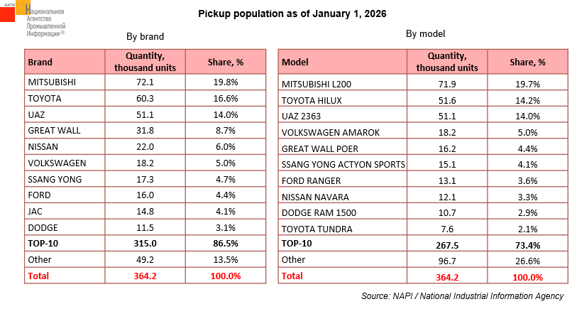 MITSUBISHI pickups make up a significant part of the population, accounting for 19.8%. Toyota ranks second in the pickup population with a 16.6% share. UAZ rounds out TOP-3 with a 14.0% share. The TOP-10 list of most popular models also included the Chinese GREAT WALL (8.7%) and JAC (4.1%) brands.