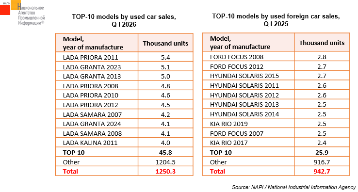 According to the marketing agency NAPI, 1.3 million used cars were sold in January-March 2026. Of these, 24.6% were Russian-branded cars (0.3 million units), and 75.4% were foreign-branded cars (0.9 million units).