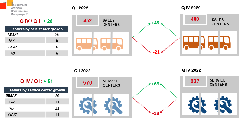 According to the NAPI, in Q IV 2022, the number of bus sales centers increased by 28 units on Q I. In Q IV of the current year, there are 480 bus sales centers. The number of bus service centers grew by 51 units. The dealer and service networks of PAZ, KAVZ, and LIAZ brands increased the most.