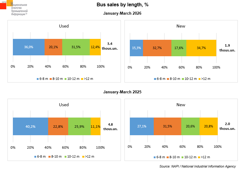 Among new vehicles, the share of 8-10 m (+1.2 p.p.) and over 12 m (+13.9 p.p.) buses increased, while that of 6-8 m (-11.8 p.p.) and 10-12 m (-3.0 p.p.) buses fell. Buses over 12 meters (34.7%) and 8-10 meters (32.7%) long accounted for the largest share of new vehicle sales in January-March 2026.