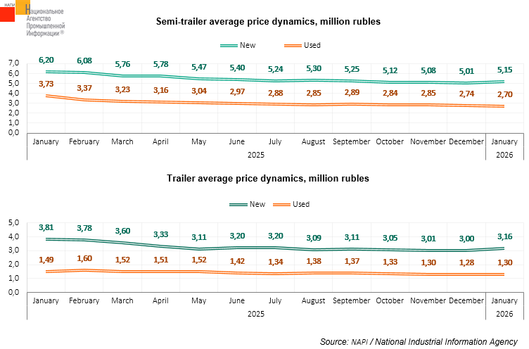 The marketing agency NAPI analyzed the dynamics of average prices for new and used* trailers and semi-trailers. Over the year, from January 2025 to January 2026, the cost of trailers and semi-trailers decreased. The average price for new semi-trailers fell by 16.8%, while that for used ones - by 27.6%. The average price for new trailers was down by 17.0%, while that for used ones - by 13.2%.