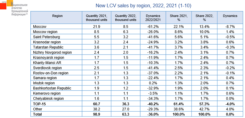 According to the NAPI data, over ten months of the current year, light commercial vehicle sales in Moscow fell more than the market - by 61.2% on the same period of the last year, while the market as a whole declined by 36%. As a result, the Moscow's share in the new light commercial vehicle sales decreased to 13.4%. The share of TOP-15 largest regions fell by 4% in January-October 2022.