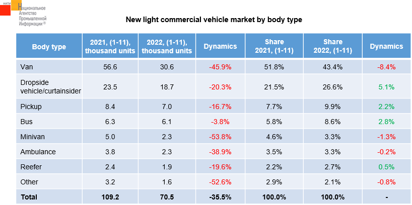 According to the NAPI, over 11 months of 2022, new light commercial vehicle sales decreased by 35.5%. Vans showed the largest sales during this period, although their share fell by 8.4% on the same period of the last year. Sales of dropside vehicles/curtainsiders, pickups, and buses have not decreased so much this year, which allowed these types of vehicles to increase their market share.