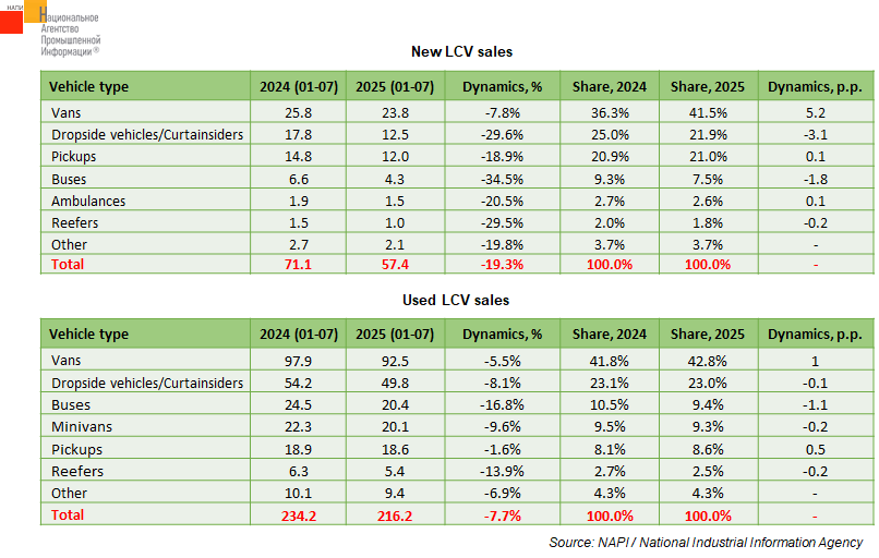 According to the marketing agency NAPI, 57.4 thousand new and 216.2 thousand used light commercial vehicles (LCV) were sold in January-July 2025.* Over the year, sales of new vehicles decreased by 19.3%, and those of used ones - by 7.7%. It should be emphasized that both sales tops include the same LCV types. Vans remain the most stable among them: over the first seven months of the current year, sales of new vans fell by only 7.8%, while those of used ones - by 5.5%. Pickups also managed to stay above the market: their sales decreased by 18.9% and 1.6%, respectively. Bus sales fell the most in the new and used vehicle markets - by 34.5% and 16.5%, respectively. It is worth noting that the used vehicle market is showing greater stability than the new one. The share dynamics of the first one fluctuates from -1.1 to 1 p.p., while the second – from -3.1 to 5.2 p.p.