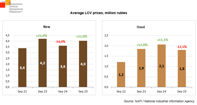In September 2025, the average price for a new light commercial vehicle reached 4 million rubles, which was a 12% rise on September 2024. The price for used LCV made 1.8 million rubles, having shown a 12.5% decline on 2024.
