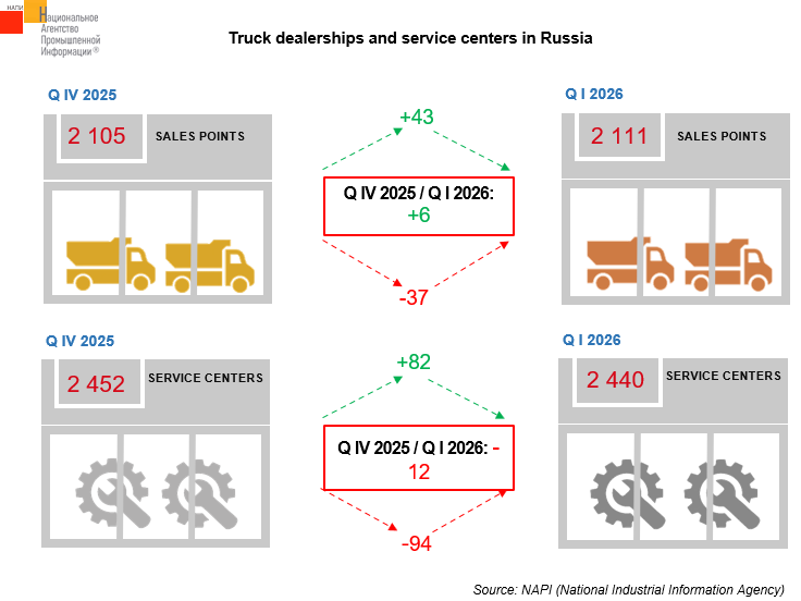 The marketing agency NAPI has updated its report on truck dealerships and service centers in Q I 2026. Compared to Q IV 2025, the number of authorized sales points increased by 6 units, while the number of authorized service centers decreased by 12 units.