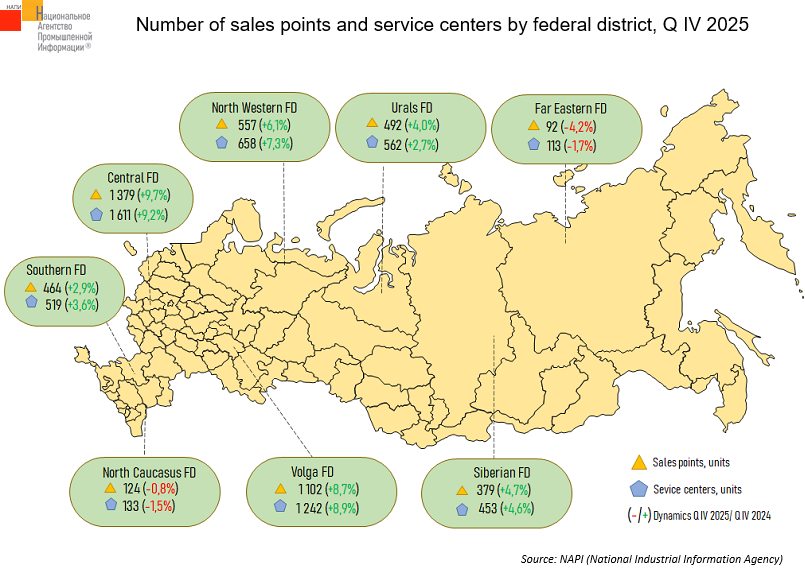 The number of sales points increased most significantly in the Central (+122 units) and Volga (+88 units) Federal Districts. The number of service centers also grew the most in these districts, by 136 units and 101 units, respectively. The number of sales points and service centers decreased only in the North Caucasus and Far Eastern Federal Districts.