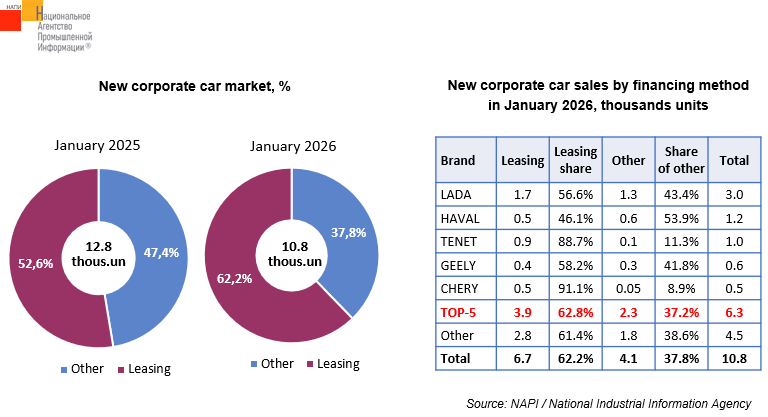 According to the marketing agency NAPI, 10.8 thousand new cars were sold to corporate clients in January 2026, including 6.7 units thousand units under financial and operational leasing.