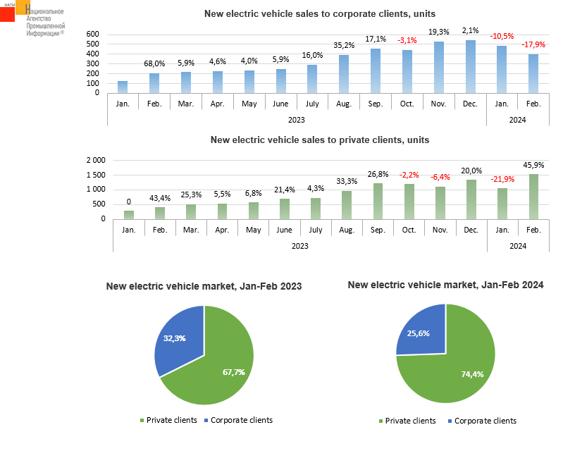 According to the marketing agency NAPI, over two months of the current year, sales of new electric vehicles to corporate clients increased by 170%, while sales to private clients - by 276%. Over two months of the current year, corporate clients purchased 0.9 thousand electric vehicles, private clients - 2.6 thousand units. If in January-February last year, corporate clients purchased almost a third of new electric vehicles, then this year corporate clients account for only a quarter of new electric vehicle sales.