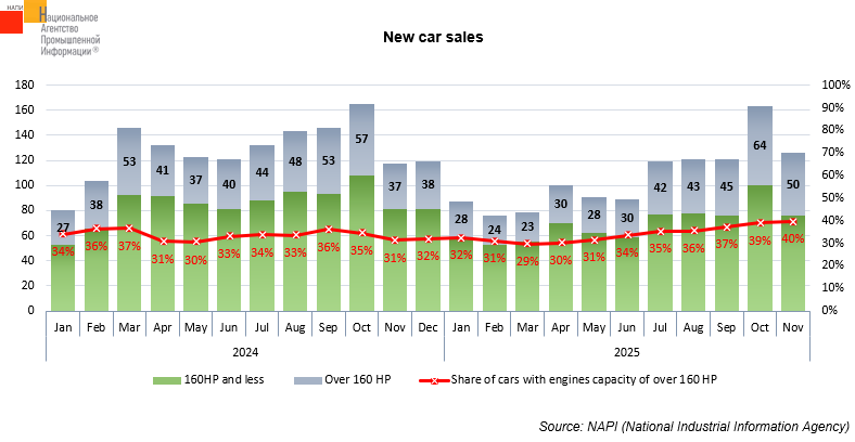 The marketing agency NAPI analyzed the dynamics of new car sales by engine capacity. In January-November 2025, 1,171.6 thousand new cars were sold, which was a 16.9% decline on the similar period of 2024. Of them, 406.6 thousand units with engines capacity of over 160 HP (-14.4% on 2024) and 765 thousand units with engines capacity of 160 HP or less (-18.1%) were sold.