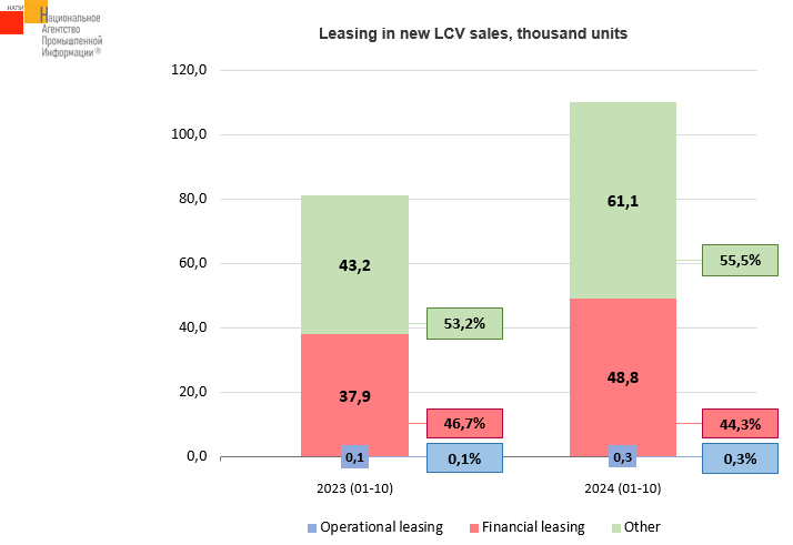 According to the marketing agency NAPI, over the first ten months of 2024, 49.1 thousand new light commercial vehicles (LCV)* were issued for financial and operational leasing, which was a 29% rise on the previous year. At the same time, the new LCV market grew by 36%, as a result, the share of vehicles leased fell to 44.6%.