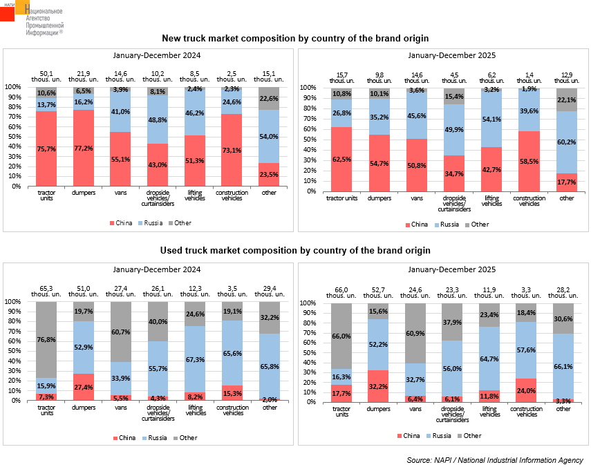 In the new truck sales composition, the share of Chinese vehicles fell in all segments. The sharpest decline was shown by dumper (-22.5 p.p.), tractor unit (-13.2 p.p.), and construction vehicle (-14.6 p.p.) segments. Despite the decline, in 2025, Chinese vehicles accounted for more than half of new truck sales in tractor unit (62.5%), construction vehicle (58.5%), dumper (54.7%), and van (50.8%) segments.