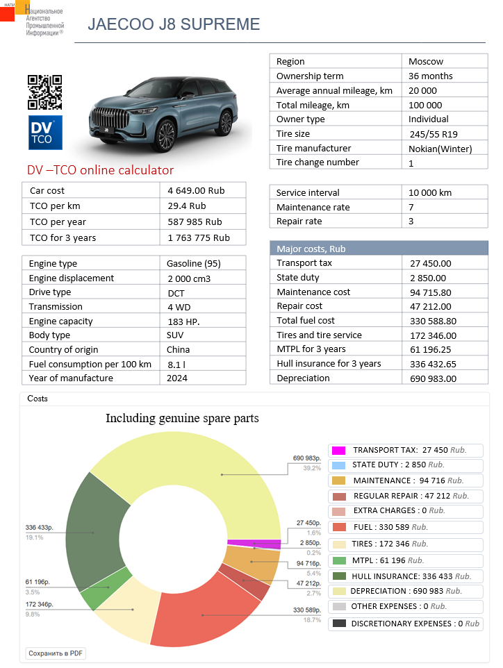 The marketing agency NAPI / National Industrial Information Agency / analyzed the total cost of ownership of JAECOO J8 Supreme car for an individual in Moscow for three years, using the DV – TCO online calculator.