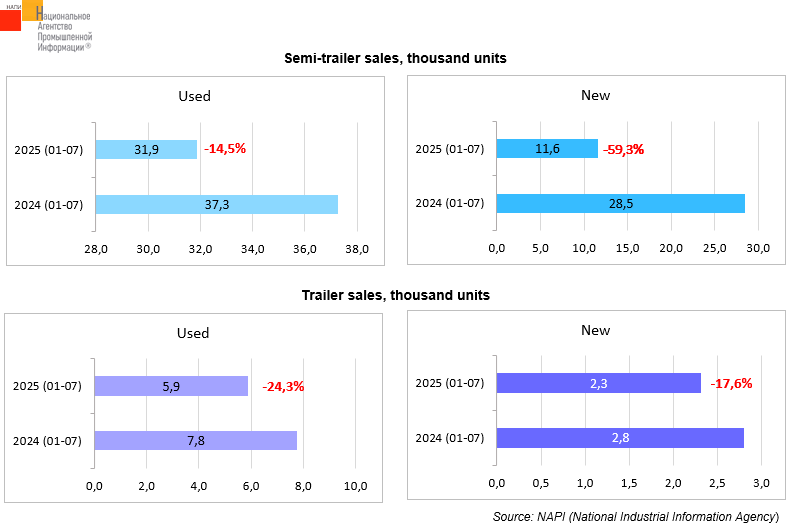 The marketing agency NAPI analyzed sales of trailers and semi-trailers in January-July 2025. Over the first seven months of the current year, 51.7 thousand new and used trailers and semi-trailers were sold, which was a 32.3% decline on the similar period of 2024. In the new vehicle market, sales of semi-trailers fell by 59.3%, those of trailers - by 17.6%. Purchases of used semi-trailers decreased by 14.5%, those of trailers - by 24.3%.