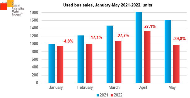 According to the data of NAPI/Russian Automotive Market Research, over the first five months of 2022, 5.3 thousand used buses were sold. Following results of five months of the last year, the used bus market reached 7.1 thousand units. The demand for used buses in 2022 significantly fell (-25.3%). It should be noted that for all five months of 2022, used bus sales have been declining. The worst month was May 2022, when used bus sales fell by 39.8%.