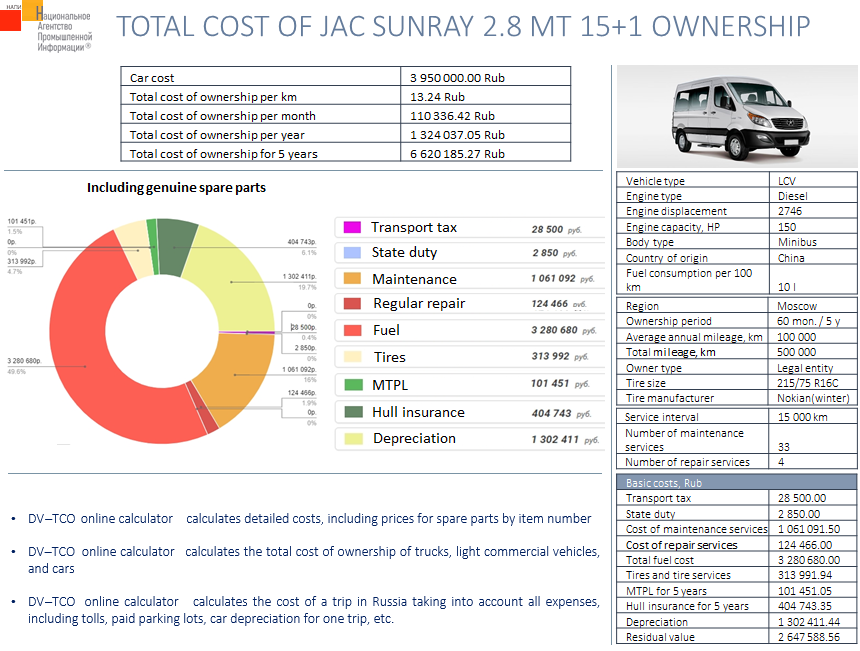 The marketing agency NAPI (National Industrial Information Agency) analyzed the total cost of a light commercial vehicle JAC SUNRAY 2.8 MT 15+1 ownership.
