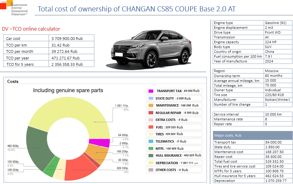The marketing agency NAPI (National Industrial Information Agency) analyzed the total cost of ownership of CHANGAN CS85 COUPE Base 2.0 AT car.