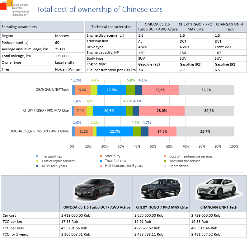 The marketing agency NAPI (National Industrial Information Agency) analyzed total cost of ownership of Chinese OMODA C5 1.6 Turbo DCT7 AWD Active, CHERY TIGGO 7 PRO MAX Elite, CHANGAN UNI-T Tech cars for legal entities.