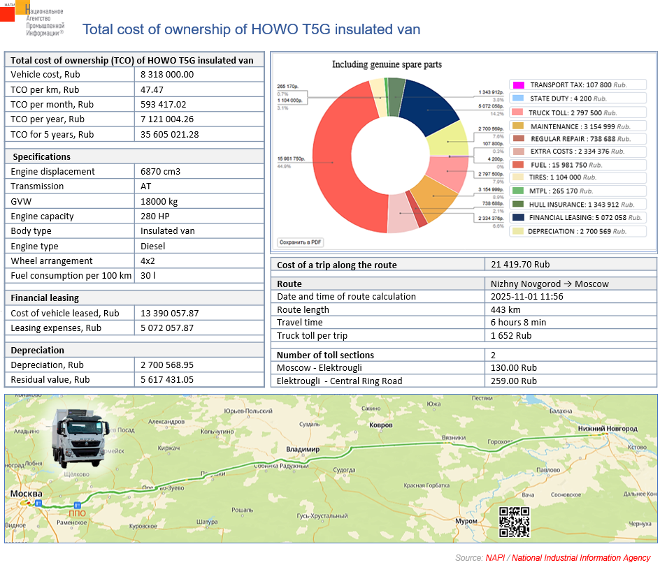 The cost of a trip by HOWO T5G from Nizhny Novgorod to Moscow is also calculated, taking into account the total cost of ownership.