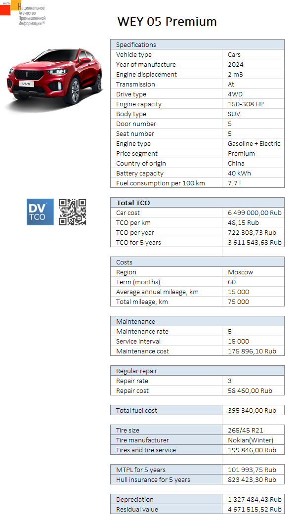 The marketing agency NAPI (National Industrial Information Agency) analyzed the total cost of ownership of WEY 05 Premium car.