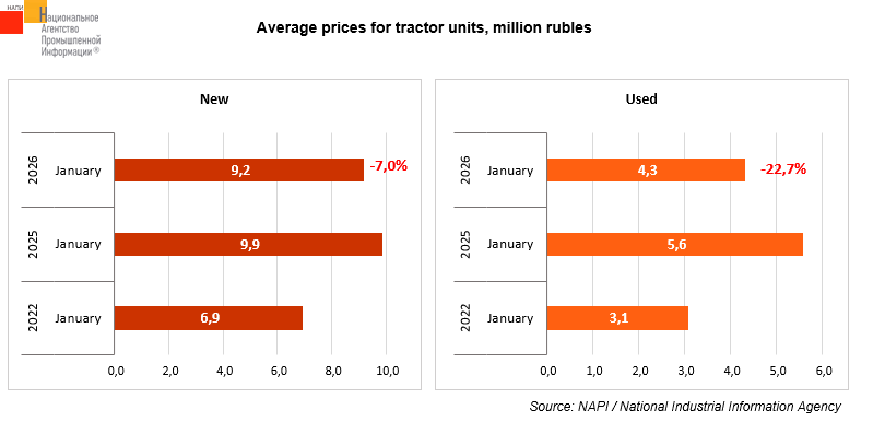 In January 2026, prices for new tractor units decreased, reaching 9.2 million rubles (-7%). The average price for used vehicles sharply declined: the tractor unit cost fell to 4.3 million rubles (-22.7%).