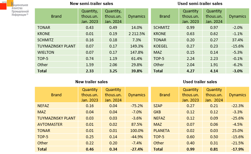 According to the marketing agency NAPI, in January 2024, new semi-trailer sales increased by 39.8%, while sales of used ones fell by 3.0%. In January 2024, the new and used trailer market decreased by 27.4% and 17.9%, respectively.