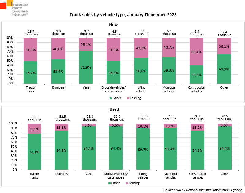 According to the marketing agency NAPI, 54.5 thousand new and used trucks* were leased in January to December 2025, which was a 46.7% decline on the previous year, when 102.4 thousand trucks were leased. Of the total number of trucks leased, 26.1 thousand units were new (-66.3% on 2024), and 28.5 thousand units were used (+13.4%). In 2025, the share of leasing in new truck sales decreased from 62.8% to 43.3%, while that in used truck sales grew from 11.8% to 13.7%.