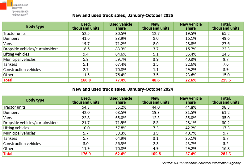 According to the marketing agency NAPI, 215.5 thousand new and used trucks* were sold in January-October 2025, which was a 23.7% decline on the previous year, when 282.5 thousand trucks were sold. So, used truck sales decreased by 5.7%, while sales of new vehicles fell by 53.9%.