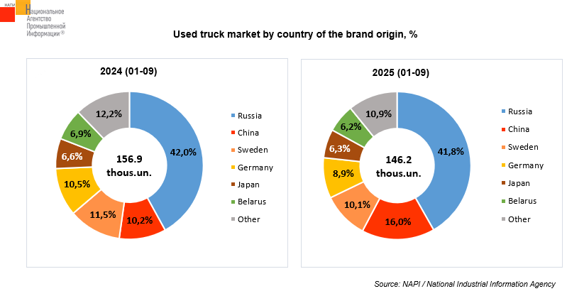 Over the year, the share of Russian used trucks decreased from 42% to 41.8%, while that of Chinese ones grew from 10.2% to 16%. The share of German trucks fell the most, by 1.6 p.p. to 8.9%.