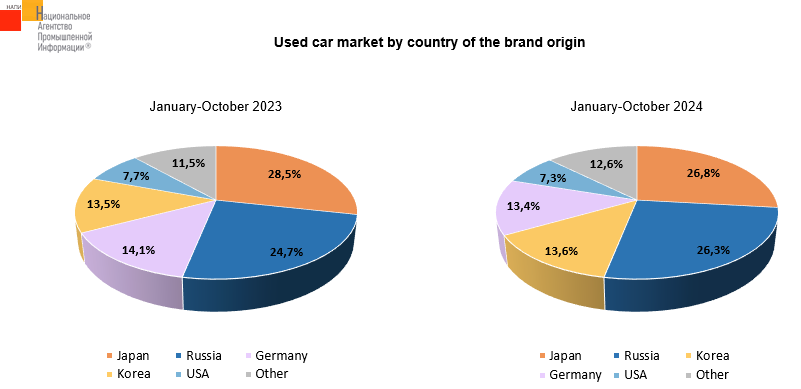 According to the marketing agency NAPI, Japanese cars are still in the greatest demand in the used car market: they account for almost 27%. However, sales of Japanese cars decreased by 11.8% over the first ten months of 2024, while the entire used car market - by 6.3%. Russian and Korean cars felt better than the market: their sales fell by 0.2% and 5.5%, respectively.