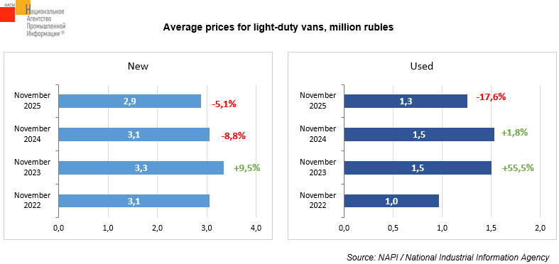 The price for new vans increased most significantly in 2023. In November, new vans appreciated by 9.5% to 3.3 million rubles, while used vans - by 55.5% to 1.5 million rubles.