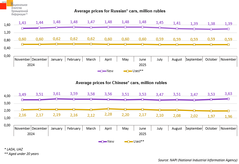Over the year, from November 2024 to November 2025, the average price for new traditional Russian* cars decreased by 2.7%, while that for used** ones - by 2.9%. At the same time, the average price for new Chinese cars grew by 4%, while that for used ones fell by 9%.