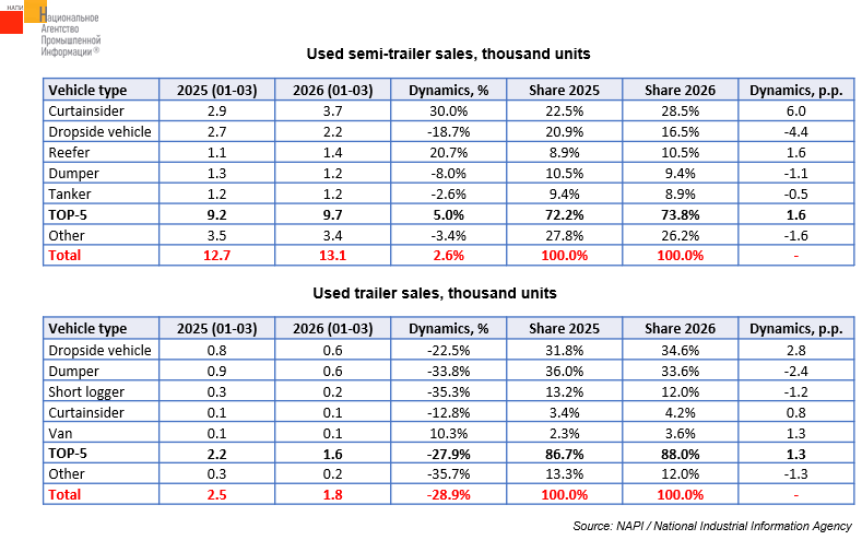 According to the marketing agency NAPI, 13.1 thousand used semi-trailers were sold in January-March 2026, which was a 2.6% rise year-on-year. Sales of curtain-sided semi-trailers (30.0%) and reefers (20.7%) increased over the year. However, sales of dropside (-18.7%) and dump semi-trailers (-8.0%), as well as tankers (-2.6%), fell. Sales of TOP-5 semi-trailers grew by 5.0%, accounting for almost 74% of total semi-trailer sales.